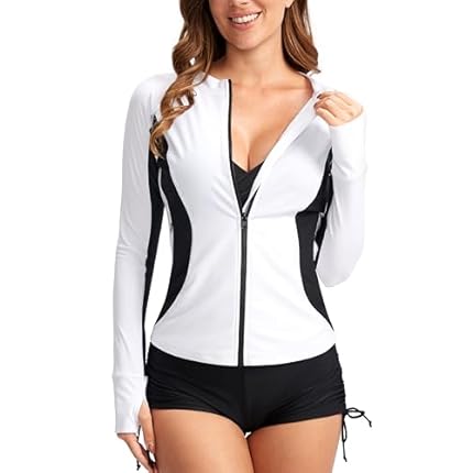 SANTINY Women’s Rash Guard Zipper Pockets UPF50+ Sun Protection Long Sleeve Swimsuit Top Zip Front Swim Shirt for Women