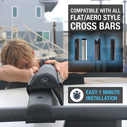 SAFELY CARRY SURFBOARDS and SUP PADDLEBOARDS on vehicles with built-in roof racks and Aero/flat/plank style crossbars. Compatible crossbars: Yakima Jetstream or HD or Corebar, factory crossbars, and any universal “Aero” or flat style cross bars.