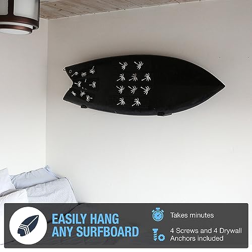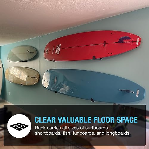 EASILY MOUNT YOUR SURFBOARD to your wall for display or storage (indoors or outdoors). Rack fits all sizes of surf boards… shortboards, fish, funboards, and longboards.