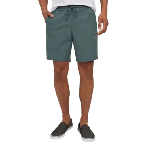 Amphibian Board Shorts for Men. Features include: Collection: Everyday collection, Fabric: 4-way stretch recycled polyester blend fabric, Coating: PFC free hydrophobic treatment, Water repellent, Fit: Straight leg fit, Waist: Classic comfort waistband, Outseams: 18″ outseam, short length, Pockets: Side-entry pockets, Back pocket with water resistant auto lock zipper, Closure: Fixed drawcord closure, Branding: Iconic Mountain & Wave logo, Other Features: Key bungee cord side pocket, Recycled yarn.