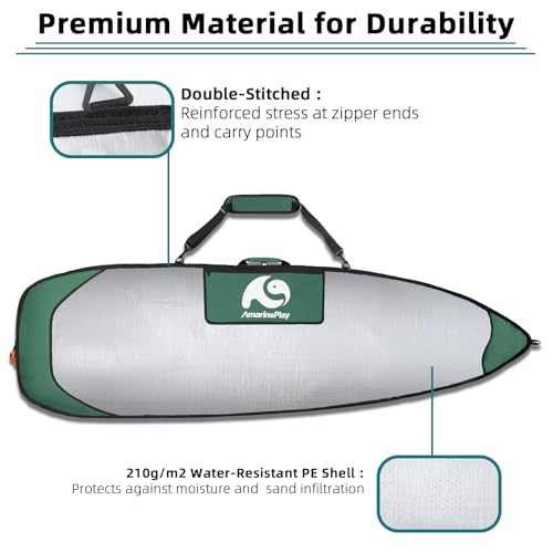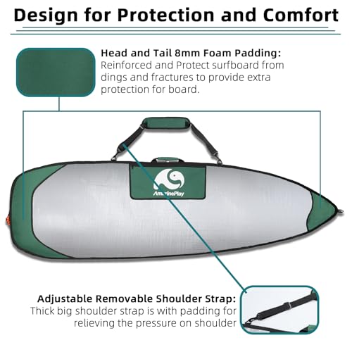 Maximum protect surfboard: The foam padded surf board cover for storage and transport surfboard is with durable heavy-duty quality 210g/m2 water-resistant PE shell and UV reflective to keep the surfboard cool.The head and tail sections of the surf-day-bag are reinforced with 8mm foam padding to protect surf board from dings and fractures.