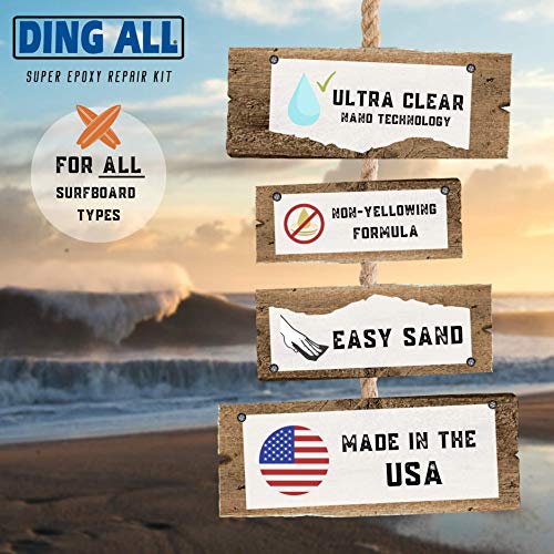 SUPERIOR DING REPAIR PRODUCT: Ding All Epoxy Resin is ultra-clear, non-yellowing and UV stable with a super strong flex to weight ratio and is proudly MADE IN USA. This resin is non tacky and dries smooth providing the user an easy surface to finish sanding.