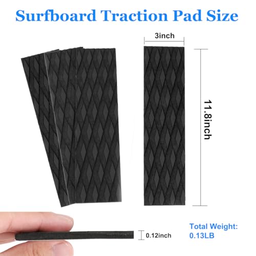 Full Size Non-Slip Pad: Each piece Size Approx. 12.2 x 3.15 x 0.2 inch, It is trimmable and versatile.You can also use 4 pieces side by side, total weight of 4 pieces is 0.13LB, it’s perfect for SUP boards, surfboards, boat decks, kayaks, skateboards, swimming pool steps, skateboards, and more.