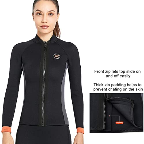 [Front Zipper Design] The wetsuit jacket with front zipper is easier for put on and take off .adopted by high quality neoprene,smooth and high elasticity to fit your body well.There is a layer of fabric inside the zipper to avoid zipper damage to the skin.