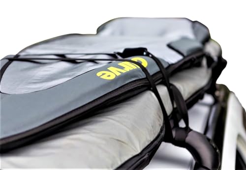 The Armourdillo surfboard travel bag is, like its name suggests, surrounded with some serious padded ‘armor’ from just about every angle. Strategically located Mega padded 20mm (3/4″) foam blocks on each side of the nose, tail and also rail zones – means your board is super protected at its most vulnerable points, and edges – with at least double the padding of standard premium travel bags. Armourdillo is for those serious about protecting their surfboard…. the only thing it wont do is roll up into an armored ball. What it will do is protect your surfboard from nose to tail providing unrivaled protection in key damage zones. And because the boosted padded zones are in key areas, the overall weight of the bag is kept down and remains surprisingly manageable. Each bag also features Curves unique Tail Protection Strap System (TPSS) built-in internal strap that wraps around the tail to hold your board secure inside the bag. The zipper is premium PK big tooth nylon zipper that is super durable and guaranteed not to corrode. Brought to you by Curve (same guys behind the acclaimed Boost bag) – Armourdillo mega boosted board protection – from Nose to Tail, including Rails!! SIZING: note length & width dims to fit surfboards up to that length and width, followed by nose shape. Eg 5’9×23″ fits surfboard up to and including 5’9 tall, up to and including 23″ wide, with hybrid (semi pointed) nose. SIZE LIST: 5’9×23″ hybrid, 6’0x23″ hybrid, 6’3×24″ hybrid, 6’6×24″ hybrid, 6’6×24″ round, 6’10×24″ hybrid, 6’10×24″ round, *new* 7’2×24″ hybrid, 7’3×24″ round NOTE: mini simmons style boards 6’3 long and shorter with a FULL ROUND NOSE (ie semi circle longboard style nose shape) are available from size 5’3 to 6’3 (please see our other listing). Please contact us if unsure. Likewise large bolt & plate style rear fins (eg 6″, 7″, etc) may take extra 2″ of length. Please contact us if unsure. Thanks & stay stoked!