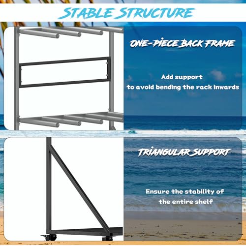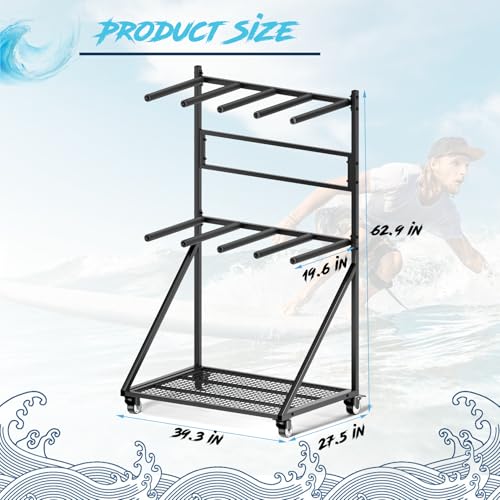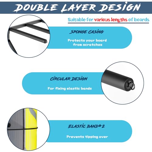 Double Layer Design – The surfboard rack measures 39.3*27.5*62.9in, the double layered stopper arm design not only meets the storage of shortboards, but also ensures that 9 feet longboards can be placed easily without worrying about long boards being too long and tipping over
