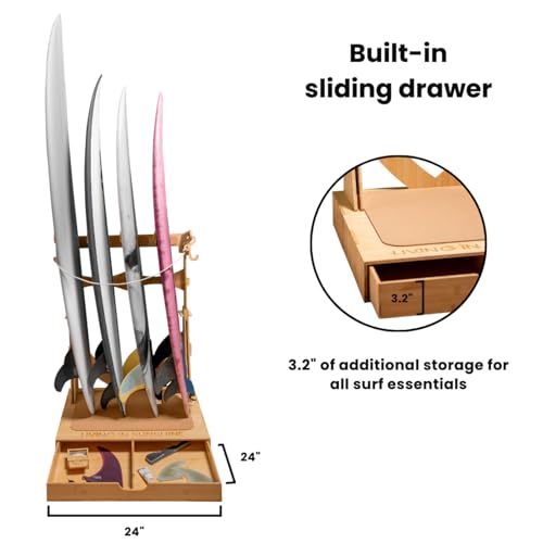 VERSATILE STORAGE FOR SURF ACCESSORIES: Stay organized with a built-in sliding drawer, hanging hooks, and a security rope. This surfboard floor stand provides ample space for wax, sunscreen, leashes, fins, and more, ensuring everything you need is within reach. A must-have surf rack apartment solution for keeping your gear in order.