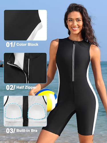 ATTRACO Boyleg One Piece Swimsuits for Women Athletic Bathing Suits Color Block Zip Up Swimwear