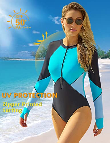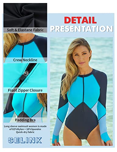 SELINK Women’s Long Sleeve Rash Guard UV Protection Zipper Printed Surfing One Piece Swimsuit Bathing Suit